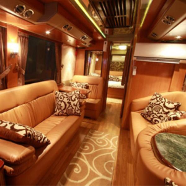 Bus yang memiliki dimensi 12x2,5 meter itu disulap menjadi hotel bintang lima dengan segudang kenyamanan. Fasilitas yang ditawarkan tak kalah dengan bus-bus premium lainnya, yakni karoeke, kursi pijat, AC, sofa, home theater, dan kitchen set berukuran kecil.