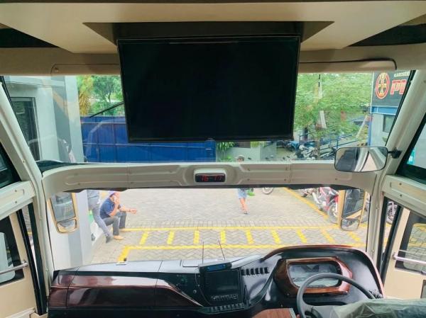 Fitur pelengkap lainnya ada TV yang menggantung di bagian depan bus untuk hiburan penumpang selama perjalanan.