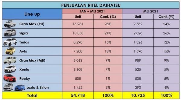 Total selama 5 bulan, penjualan ritel Daihatsu didukung tiga backbone, yakni Gran Max PU (Pick Up) sebanyak 15.231 unit (28 persen), disusul Sigra 13.353 unit (24 persen), dan Terios 8.298 unit (15 persen).