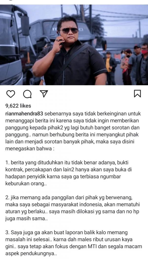 Di sisi lain, Rian Mahendra melalui akun Instagramnya membantah tuduhan tersebut. Dia siap memenuhi panggilan polisi dan melaporkan balik kasus tersebut.