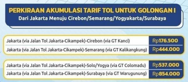 Otomotif Niaga Detail Berita Intip Tarif Tol Trans Jawa Mobil Golongan I, Mudik Lebaran Jakarta-Surabaya Rp854.000 Rabu, 27 Maret 2024 - 11:49:00 WIB Share copy link article Link Copied! Dani M Dahwilani Sebelum melakukan perjalanan mudik Lebaran lewat Tol Trans Jawa, perhatikan saldo kartu elektronik tol (eToll) Anda cukup. (Fot: Instagram Jasa Marg)