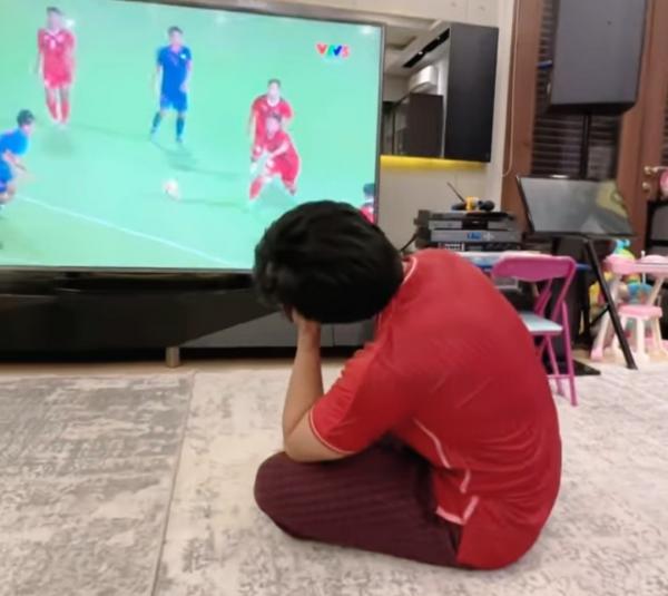 Ayah anak satu ini terlihat antusias menonton pertandingan sepak bola dengan memakai baju timnas Indonesia. Sejak babak awal ia pun tak berhenti berharap untuk kemenangan tim jagoannya.