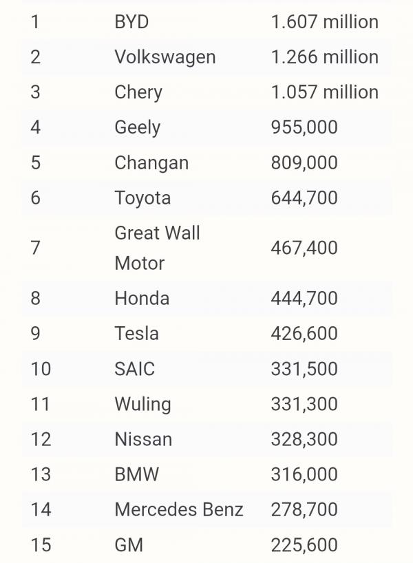 Volume penjualan merek Amerika dan Prancis menurun masing-masing sebesar 19,2 persen dan 19,1 persen. Angka ini menunjukkan mobil energi baru asal China mendominasi pasar.