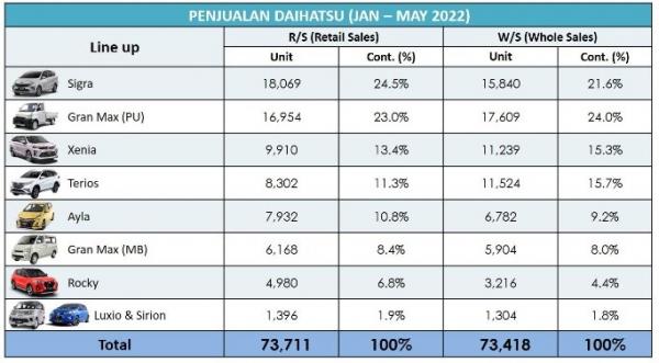 Secara volume kontribusi penjualan ritel Daihatsu masih didominasi tiga model. Ketiga mobil tersebut adalah Sigra 18.069 unit (24,5 persen), Gran Max PU (Pick Up) 16.954 unit (23 persen), dan Xenia 9.910 unit (13,4 persen).