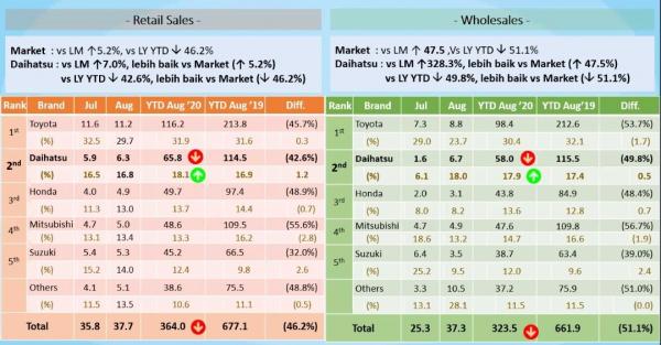 Posisi kedua ada Daihatsu, dengan wholsales mencapai 57.978 unit (turun 49,8 persen dibanding tahun lalu). Meski demikian market share turun menjadi 17,9 persen dibandingkan periode yang sama tahun lalu sebesar 17,4 persen. Terkait retail sales, penjualan Daihatsu mencapai 65.767 unit dengan peningkatan market share 18,1 persen dibandingkan periode sama tahun lalu sebesar 16,9 persen.