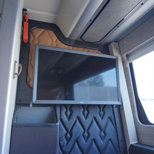 Untuk meredam suara yang lebih baik, saat masuk ke bagian dalam bus dari pintu depan, Anda bisa melihat sekat antara ruang kru bus dan juga ruang penumpang. Sekat tersebut dilengkapi kaca jendela dan pintu untuk keluar-masuk penumpang menuju kamar penumpang.