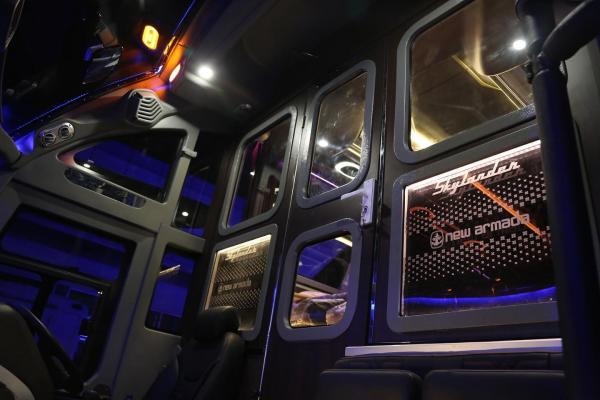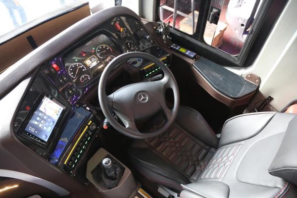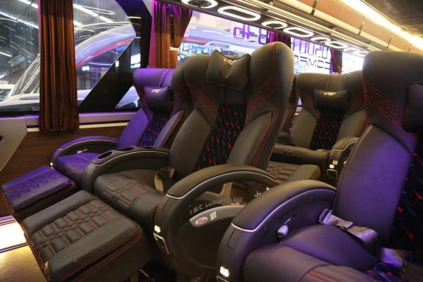 Masuk ke bagian dalam, interior bus dirancang dengan konsep mewah dengan sekat pemisah antara kabin penumpang dan kru. Kabinnya juga dibuat dengan nuansa gelap tapi tetap elegan dengan permainan cahaya.
