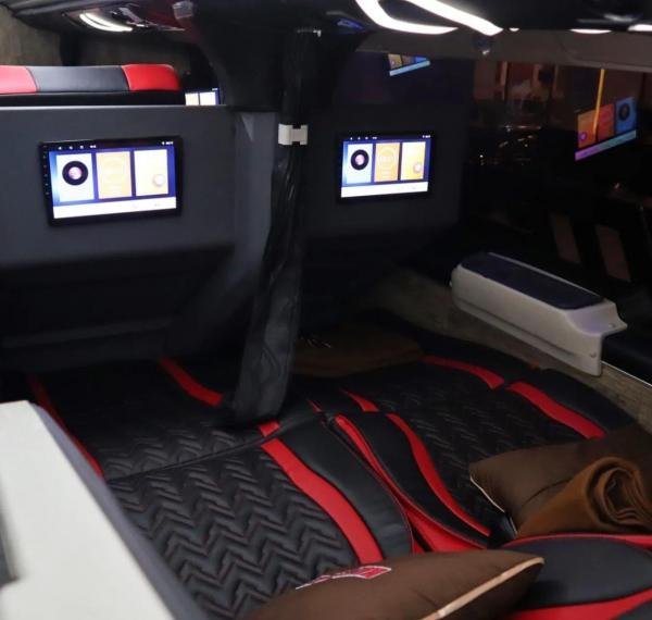 Bagian kabin bus juga lebih mewah dengan nuansa interior berwarna gelap. Permainan warna yang diterapkan cukup berkelas dengan kursi berwarna hitam dan merah. Kenyamanan penumpang kelas sleeper juga dilengkapi dengan Video on Demand (VOD). Sementara fasilitas bersama dilengakpi dengan dispenser air minum, AC dan toilet.