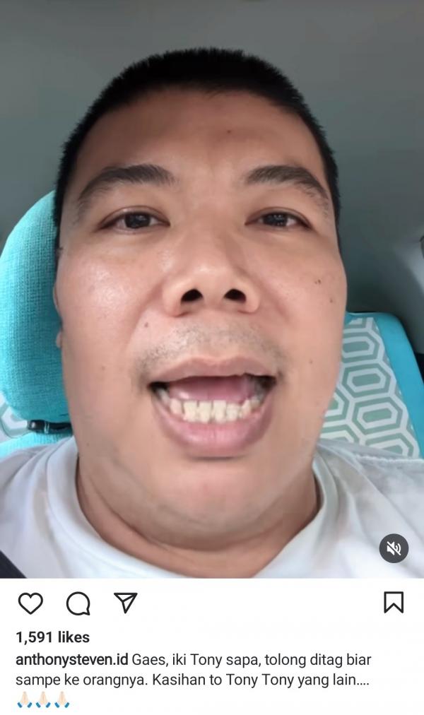 "Gaes, iki Tony sapa, tolong ditag biar sampe ke orangnya. Kasihan to Tony Tony yang lain….," kata Anthony di Instagramnya.