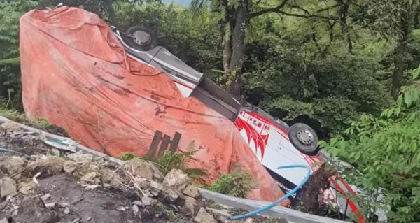 "Beruntungnya bodi bus ketahan oleh dua pohon besar yang ada di jurang. Kalau tidak jatuhnya bisa lebih dalam," ucap pemilik kanal YouTube Bagindo Channel.