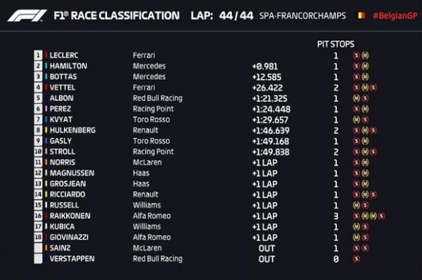 Berikut hasil GP Belgia 2019 selengkapnya: