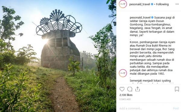 "Seperti terbangun di dalam mimpi, ya? Konon, pembangunan Gereja Ayam atau Rumah Doa Bukit Rhema ini berawal dari mimpi juga, lho! Sang pendiri bercerita, dia memperoleh mimpi aneh yaitu diminta membangun sebuah rumah doa di perbukitan asing. Sampai pada suatu ketika, dia mendapatkan petunjuk dan akhirnya rumah doa mulai dibangun pada 1992. Semenjak menjadi lokasi syuting sebuah film populer, bangunan ini semakin hits dikunjungi wisatawan. Kamu juga mau berwisata rohani ke sana?" tulis Instagram @pesonaid_travel, dikutip Sabtu (27/4/2019).