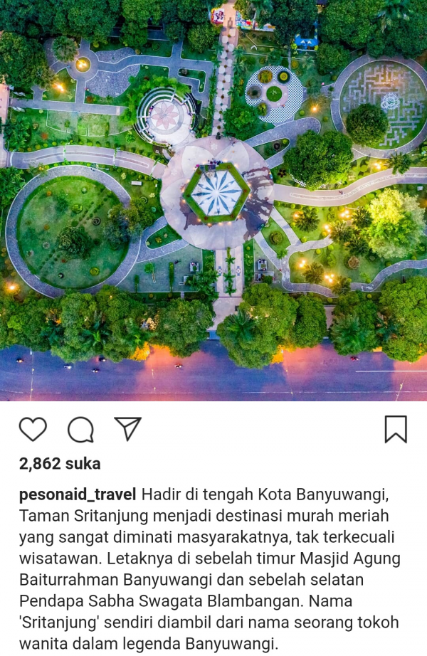"Hadir di tengah Kota Banyuwangi, Taman Sritanjung menjadi destinasi murah meriah yang sangat diminati masyarakatnya, tak terkecuali wisatawan. Letaknya di sebelah timur Masjid Agung Baiturrahman Banyuwangi dan sebelah selatan Pendapa Sabha Swagata Blambangan. Nama Sritanjung sendiri diambil dari nama seorang tokoh wanita dalam legenda Banyuwangi," tulis Instagram @pesonaid_travel, dikutip Jumat (11/10/2019).