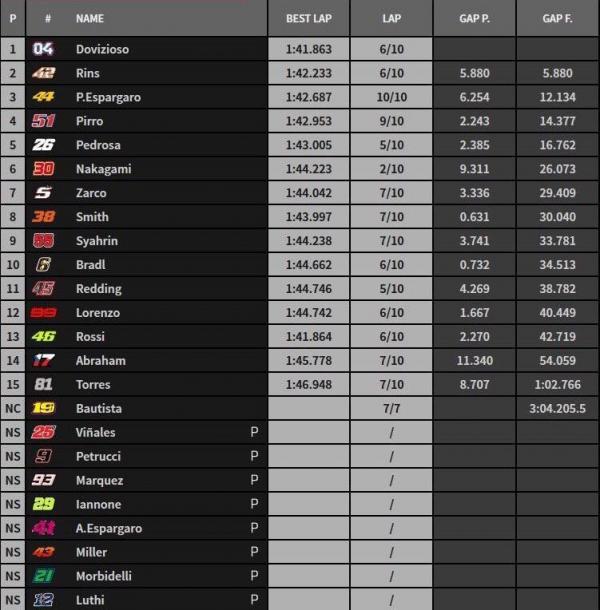 Begitu balapan kembali dimulai, Dovizioso tak membutuhkan waktu lama untuk mengambil alih posisi terdepan dari Rins. Tak mau tertinggal, Rossi pun ikut mendahului Rins beberapa putaran kemudian.