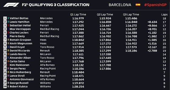 Berikut hasil kualifikasi GP Spanyol 2019 selengkapnya: