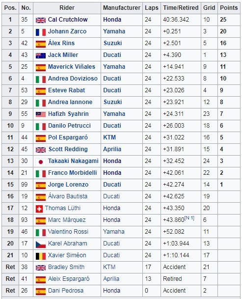 Di posisi ketiga ada pembalap Spanyol Alex Rins. Rider Australia Jack Miller finis di urutan keempat setelah memulai lomba dari posisi terdepan untuk pertama kalinya.