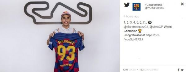 Tak hanya itu, klub raksasa La Liga, Barcelona juga memberi ucapan selamat untuk pembalap berusia 26 tahun tersebut. Seperti diketahui, Barcelona merupakan klub sepak bola yang difavoritkan oleh sang pembalap.