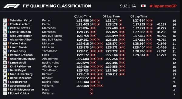 Tidak puas berada di posisi kedua, Leclerc mencoba untuk memperbaiki waktunya. Namun, Vettel bisa melaju lebih kencang dan mengamankan pole position GP Jepang dengan waktu terbaik 1 menit 27,064 detik.