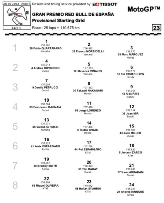 Marquez sempat berusaha untuk merebut kembali posisi terdepan. Namun, dia tak bisa memperbaiki catatan waktunya, sehingga sang juara bertahan harus puas memulai balapan dari posisi ketiga.