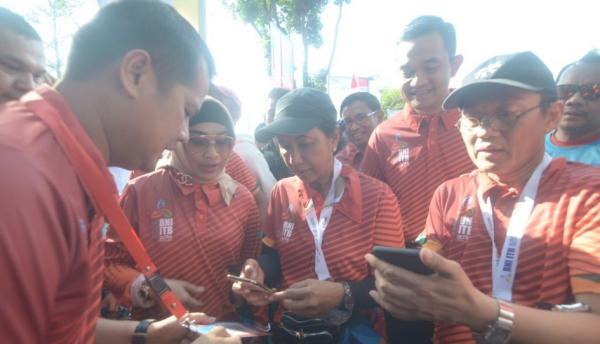 Dalam kesempatan ini, Rini M Soemarno menunjukkan aplikasi pembayaran digital LinkAja yang digunakan oleh para finisher untuk mendapatkan medali BNI ITB Ultra Maraton 2019 di Kampus ITB, Bandung, Minggu (13/10/2019). Turut mendampingi, Direktur Hubungan Kelembagaan BNI Adi Sulistyowati, Direktur Keuangan BNI Ario Bimo, dan Rektor ITB Kadarsah Suryadi, dan Ketua Panitia BNI ITB Ultra Marathon Gatot Sudariyono.