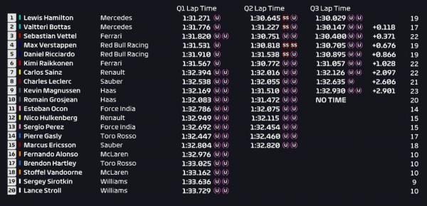 Sementara rekan setim Hamilton yakni Valtteri Bottas akan memulai balapan dari tempat kedua. Pada kualifikasi yang sempat diguyur hujan tersebut, Hamilton berhasil mencatatkan waktu 1 menit 30,029 detik.