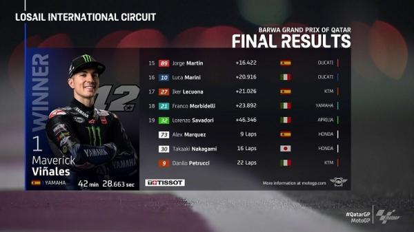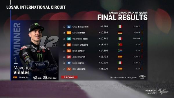 Vinales akhirnya menyentuh garis finis pertama. Ini merupakan kemenangan keduanya di Sirkuit Losail selama mengendarai M1 Yamaha. Sementara Bagnaia merosot ke urutan ketiga. Posisi kedua ditempati Zarco.