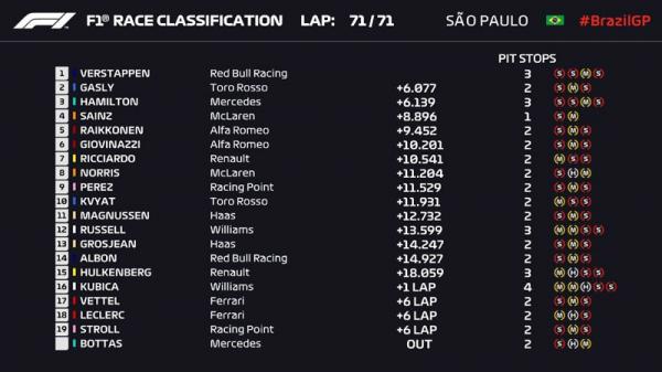 Hamilton sendiri akhirnya harus mengakhiri balapan di posisi ketiga, di belakang Verstappen dan pembalap Scuderia Toro Rosso Pierre Gasly. Namun, Hamilton mendapat penalti lima detik, akibat menabrak pembalap Red Bull Alexander Albon, sehingga podium terkahir menjadi milik Carlos Sainz Jr.