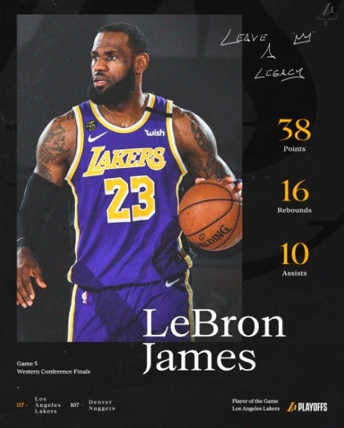 James menambahkan 16 rebound dan 10 assist, sementara Anthony Davis mencetak 27 poin untuk Lakers, yang kembali ke final untuk ke-32 kalinya, dan pertama kali sejak mereka mengangkat trofi untuk ke-16 kalinya pada 2010.