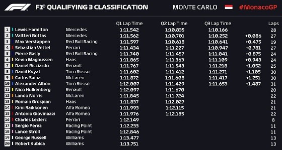 Berikut hasil kualifikasi F1 GP Monako 2019 selengkapnya:
