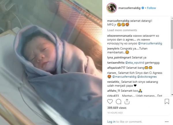 Dalam sebuah unggahan video di akun Instagram @marcusfernaldig, atlet 27 tahun itu memamerkan buah hatinya dan diberi caption, “Selamat datang! MFG Jr.”.
