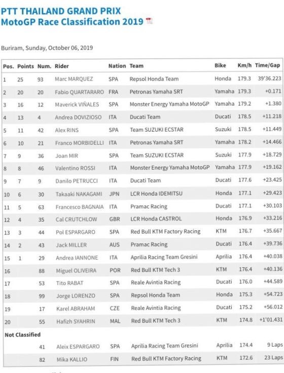 Marquez akhirnya sukses menyalip Quartararo pada putaran terakhir. Kali ini dia bisa mempertahankan posisinya untuk memenangkan balapan, sekaligus mengamankan titel juara dunia MotoGP 2019.