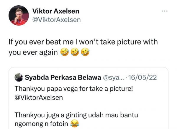 “Jika kamu bisa mengalahkanku, aku tidak akan berfoto denganmu lagi,” balas Axelsen @ViktorAxelsen dengan nada bercanda.