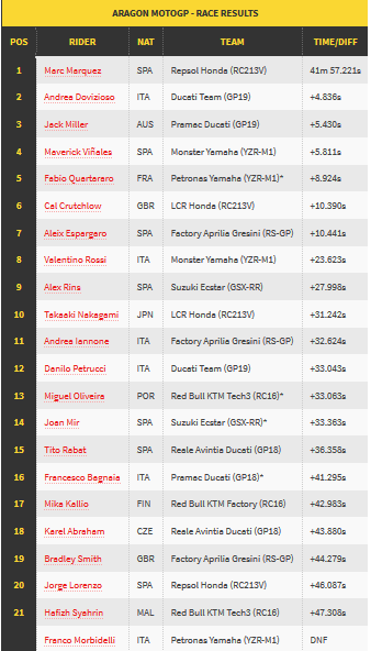 Untuk Marquez, dia unggul 4,836 detik dari Dovizioso dan 5,430 detik dari Miller saat melintasi garis finis. Baginya, ini merupakan kemenangan keempat beruntun yang terjadi di Sirkuit Aragon.