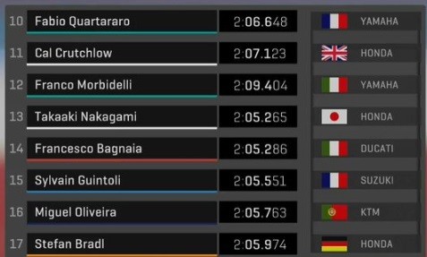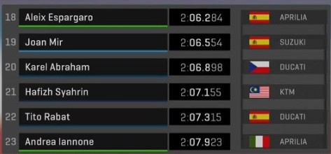 Di grid kedua yakni posisi keempat, kelima dan keenam bakal diisi Andrea Dovizioso (Ducati), Pol Espargaro (KTM) dan Alex Rins (Suzuki). Kemudian juara dunia sembilan kali Valentino Rossi (Monster Energy Yamaha) menempati peringkat ketujuh.