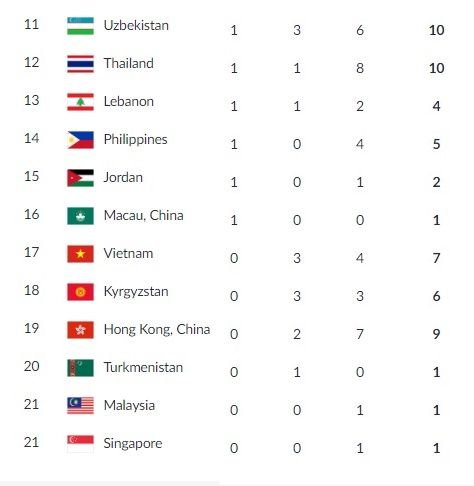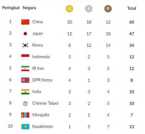China masih ada di puncak dengan torehan total 60 medali, dengan rinciannya 30 emas, 18 perak, dan 12 perunggu. Jepang coba menguntit di posisi kedua dengan 12 emas, 17 perak, dan 18 perunggu. Sedangkan di urutan ketiga ada Korea Selatan dengan 8 emas, 12 perak, dan 14 perunggu.