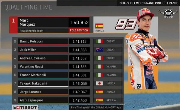 Dengan begitu, juara dunia lima kali itu berhak menempati grid terdepan pada balapan yang bakal digelar, Minggu (18/5/2019) besok malam. Sementara itu, di posisi kedua akan ditempati Danilo Petrucci (Ducati Desmosedici).