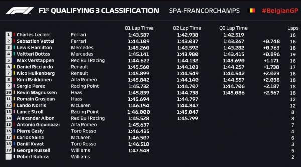 Walau demikian, catatan waktu Hamilton itu bisa dengan mudah didahului oleh Ferrari. Leclerc langsung membukukan waktu 1 menit 42,644 detik dan berhak meraih pole position.
