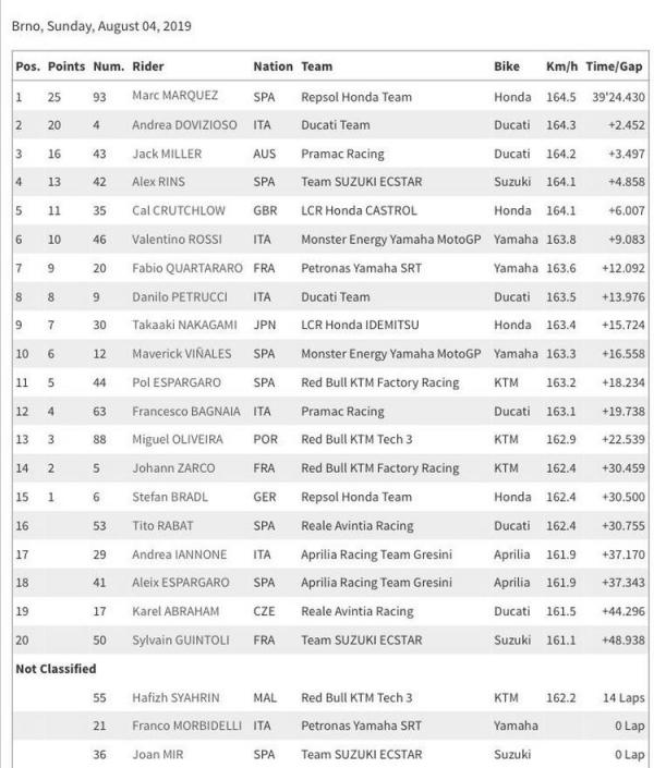 Berusaha untuk menyalip Dovizioso, Rins malah melakukan kesalahan dan kehilangan waktu. Dia nyaris didahului Miller pada putaran ke-18. Tetapi, Miller melebar, sehingga Rins bisa menyelamatkan posisi podium.