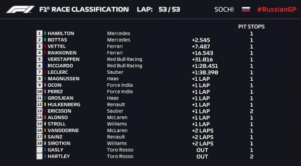 Verstappen akhirnya mengganti ban mobil di putaran ke-44 dan membuat posisinya melorot ke tempat kelima. Hamilton pun mampu memanfaatkan kesempatan itu dan kembali merebut posisi terdepan yang bertahan hingga garis finis.