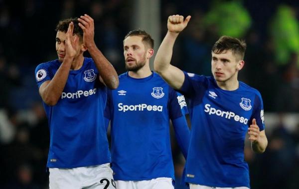 Para pemain Everton merayakan kemenangan 3-1 atas Swansea City.