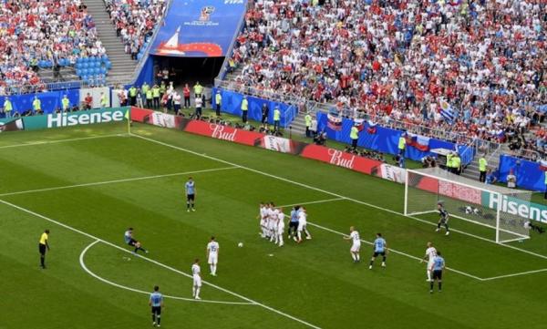 Sementara Uruguay tetap dengan gaya bermain mereka yang mengandalkan kecepatan dua striker mereka, Suarez dan Edinson Cavani. Sampai akhirnya sebuah serangan Uruguay membuat gelandang Rusia Yury Gazinskiy menjatuhkan Rodrigo Bentancur di depan kotak penalti mereka.