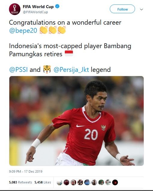 “Selamat untuk karier Anda yang gemilang @bepe20. Pemain yang paling banyak memperkuat Timnas Indonesia akhirnya memutuskan pensiun. Legendaris @PSSI dan @Persija_Jkt,” cuit FIFA.