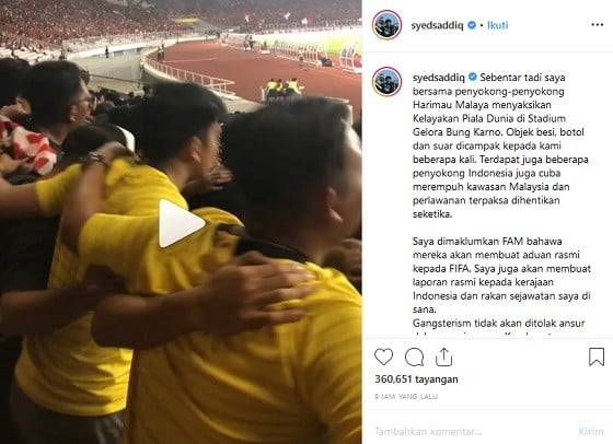 “Saya bersama pendukung Malaysia ditempatkan di dalam stadion, sementara menanti keadaan di luar reda sebelum kami boleh pulang. Kejadian ini amat menyedihkan karena industri sepak bola seharusnya jadi media persatuan. Saya berjanji akan menuntut keadilan bagi rakyat Malaysia,” katanya.