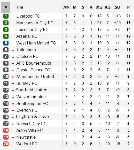 Berikut hasil keseluruhan pekan ketujuh Premier League: