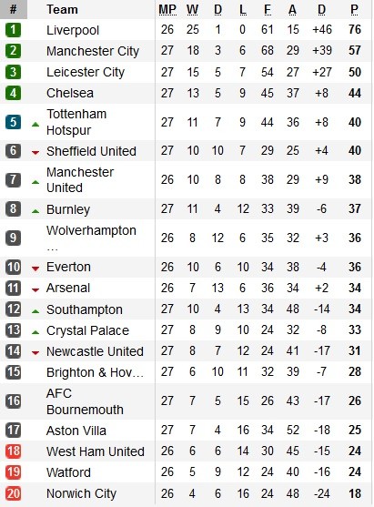 Hasil, Jadwal dan Klasemen Liga Inggris, Minggu (23/2/2020)