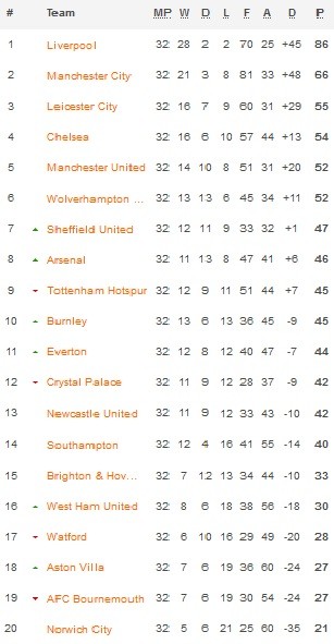 Hasil Lengkap dan Klasemen Liga Inggris Pekan Ke-32, Jumat (3/7/2020)