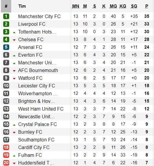 Sementara itu Chelsea harus mengakui keunggulan Tottenham dengan skor 0-3 di Wembley, Minggu (25/11/2018) dini hari WIB. Namun, Liverpool dan Manchester City merasakan hasil yang berbeda, karena keduanya meraih kemenangan.