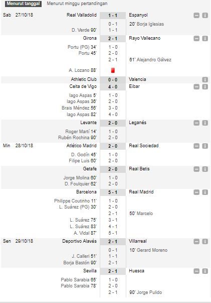 Hasil Liga Spanyol sampai Senin (29/10/2018) Dini Hari WIB