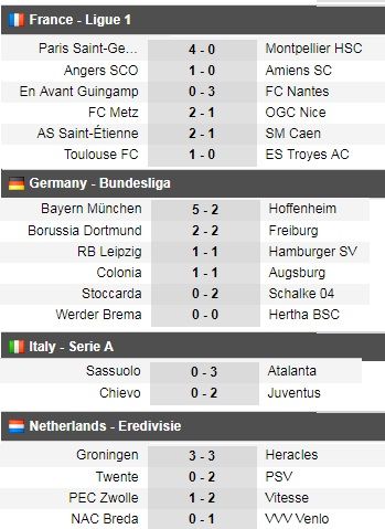 Pada Ligue 1, Paris Saint-Germain semakin mantap di singgasana sementara setelah pesta 4-0 atas Montpellier di Parc des Princes. Kemenangan 3-0 juga diraih FC Nantes atas tuan rumah En Avant Guingamp.