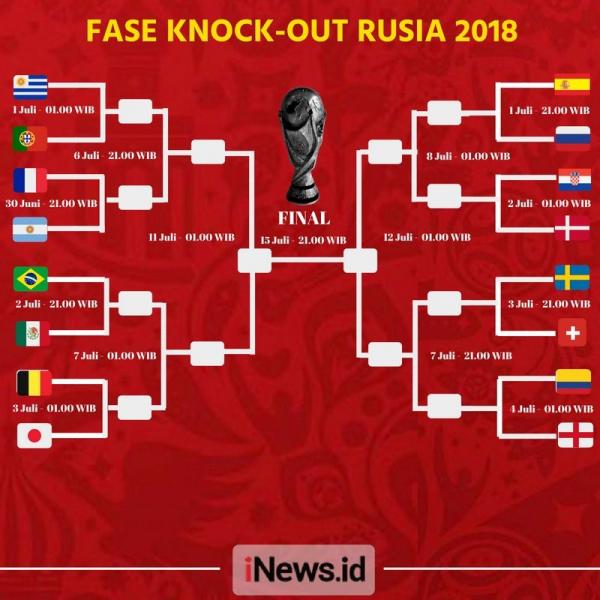 MOSKOW, iNews.id - Setelah menjalani 48 laga di penyisihan grup, Piala Dunia 2018 kini memasuki fase gugur. Dari 16 tim yang lolos ke babak berikutnya, enam tim berada di rute neraka menuju final karena tergabung di bagan sebelah kiri.